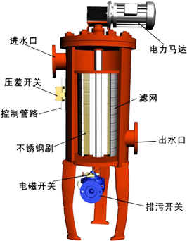 采用機(jī)電一體化設(shè)計。全自動自清洗過濾器由驅(qū)動機(jī)構(gòu)、控制管路(包括壓差開關(guān))、主管組件、濾芯組件、清洗機(jī)構(gòu)、連接法蘭等主要零部件組成。 電控器、控制管路和排污閥構(gòu)成過濾器的控制部分,用于實(shí)現(xiàn)自動清洗排污過程。 控制管路由壓差開關(guān)、管接頭、黃銅管等附件組成。過濾器常規(guī)產(chǎn)品使用不銹鋼轉(zhuǎn)刷,也可根據(jù)不同的使用條件(水溫、水質(zhì)),選用其它材質(zhì)的轉(zhuǎn)刷。